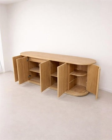 Designed with soft rounded corners, the Arco Buffet offers practical storage for dinnerware, linens, and serving essentials while maintaining a clean, sculptural silhouette. Multiple compartments and shelves provide organized functionality, making it ideal for contemporary dining rooms and open living spaces.
