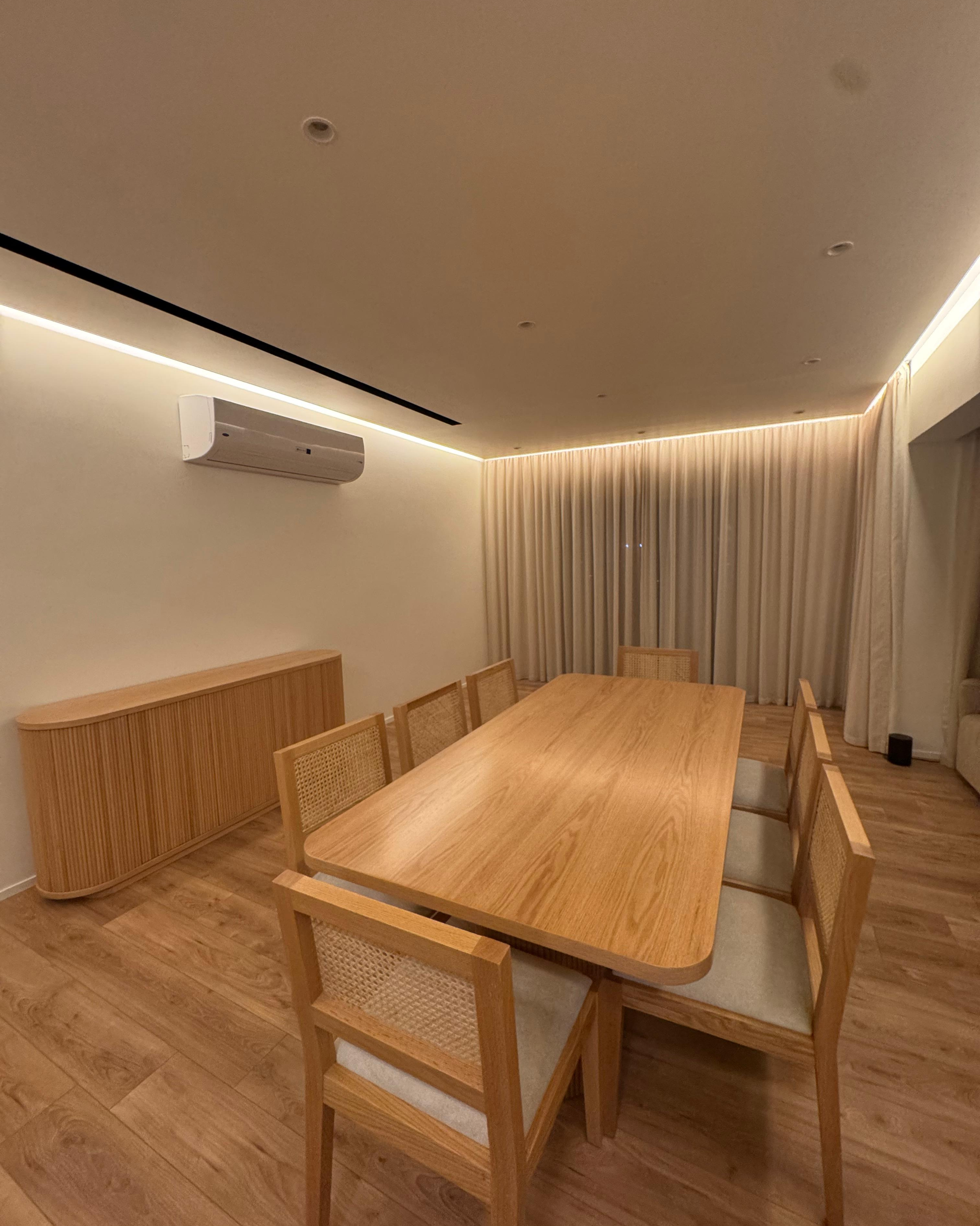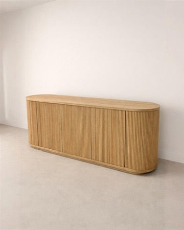 A sculptural dining buffet crafted from premium plywood with natural oak veneer, finished with elegant vertical wood strips. Featuring generous internal storage and soft rounded edges, the Arco Buffet brings modern warmth and refined organization to your dining space.